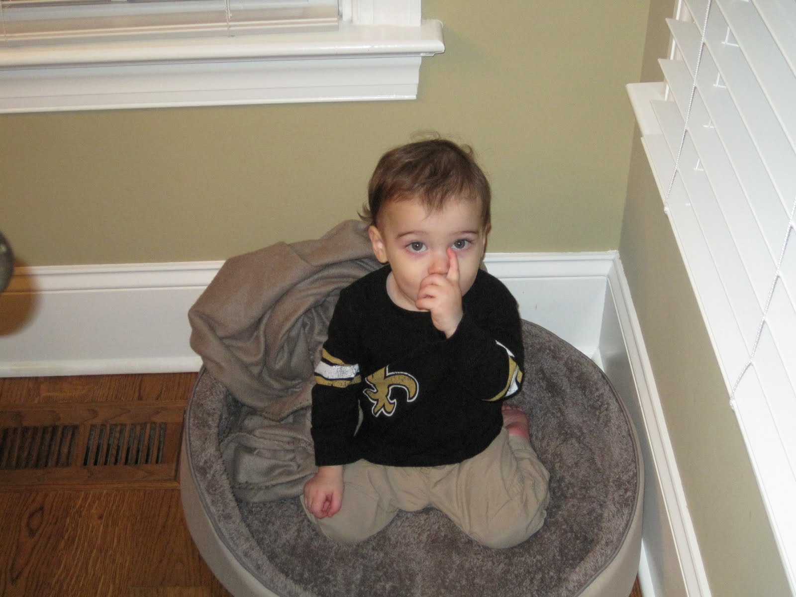 David is definitely not a baby anymore. He has entered full on toddler mode and things are pretty much David's way or the highway. It's not all bad; he is so adorable and mostly sweet but he does like things his way. He has smacked Drew a few times recently which has earned him a couple of time outs. Drew doesn't mind David's light smacks and usually laughs. The funny thing is I think David's new attitude has calmed Drew down a bit. I have rarely seen Drew bully David recently. Go David! David knows what he wants to eat and drink and will make it clear by climbing the fridge shelves or pounding the pantry door. He says "All done." and puts his hands out palms up when he's finished eating. He loves to put things away and distribute loveys, drinks and other items to each of us. It's so cute to watch him find Drew's cup, shoe or platty and immediately find Drew and deliver it with a grin. Drew is always thankful and kisses David sweetly on the head while saying, "Mom, watch how soft I kiss David." It's been 17 months and looks like that request may finally be sinking in with Drew. Just in time for David to get rough and rowdy! He loves to climb, tumble, tickle and get loud. He was "talking" so loudly at a birthday party on Sunday that George and I looked at each other and busted out laughing with the "Yeah, that's my kid." look on our faces. All of the adults were chatting while the kids were playing and all of a sudden David just started rambling. The loud sounds were flying out of his mouth and it was obvious he had something important to say although I have no idea what it was. I mentioned in the Christmas blog that Drew got a few Nerf guns. David is all over that game! Drew and I planned to attack George when he got home the other day and while we were discussing where to hide, David caught on and quickly settled into a great spot (gun in hand). He doesn't miss a beat and loves to imitate! He cleans if I'm cleaning, brushes his teeth when I brush mine, washes his hands every time Drew does and knows Bailey's routine so well that I am positive he could care for her all by himself. Here's some recent pictures of our little guy.